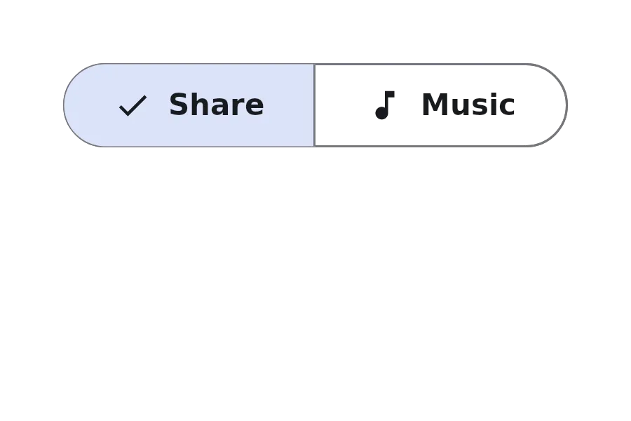 import { SegmentedButton } from "@material";export component Example inherits Window {    width: 300px;    height: 100px;    background: transparent;    SegmentedButton {        items: [            { icon: @image-url("../icons/share.svg"), text: "Share" },            { icon: @image-url("../icons/music_note.svg"), text: "Music" }        ];        current-index: 0;    }}slint